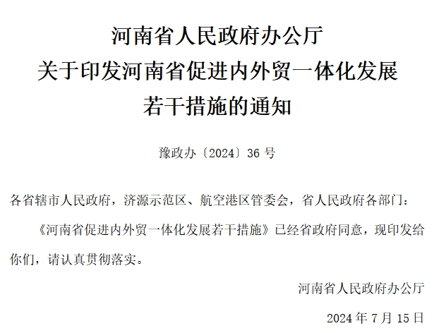 河南省人民政府辦公廳 關于印發(fā)河南省促進內(nèi)外貿(mào)一體化發(fā)展 若