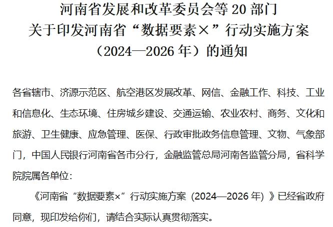河南省發(fā)展和改革委員會等20部門 關于印發(fā)河南省“數(shù)據(jù)要素×